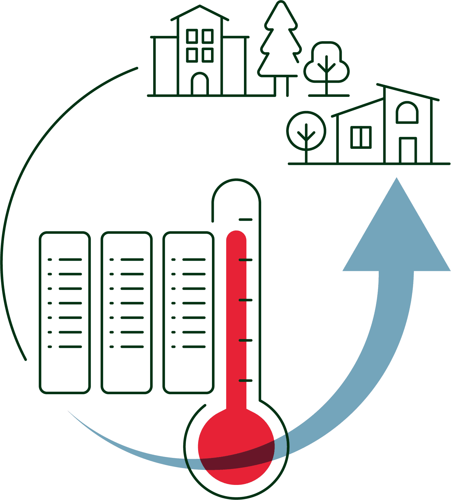 So how do we envisage this energy sharing to work? Electrical energy consumed in data centers is converted to heat from server and network loads. Having a data center close to urban areas enables us to locally recover and export this heat energy to the community.